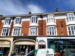 A splendid late Victorian building graces the western end of St Leonards Road – Sackville House was built in 1897. The canted upper floor bays, decorative plaster frieze and deeply overhanging eaves supported on carved console brackets stand above broad flattened arch shopfronts with borders of egg-and-dart mouldings.